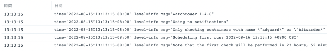 在 Watchtower 起來後,log 可以看到只檢查這幾個 container